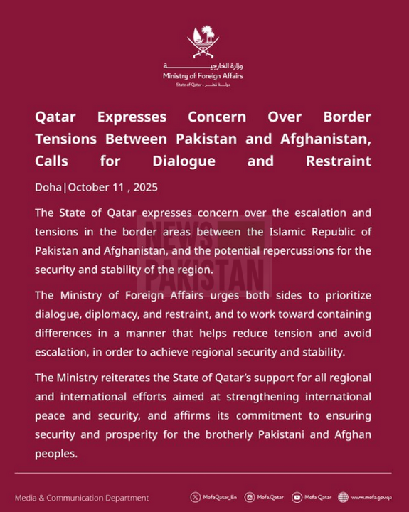 By means of a letter issued by the Media and Communication of its Ministry of Foreign Affairs, the State of Qatar stated: “Qatar expresses concern over border tensions between Pakistan and Afghanistan, calls for dialogue and restraint.