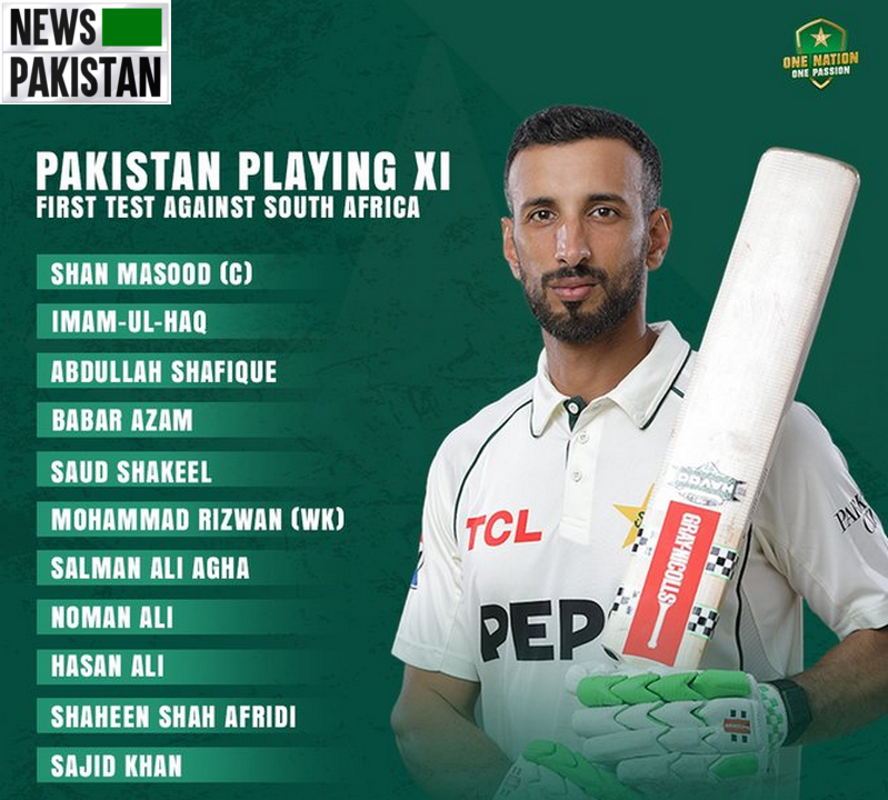 Green Shirts: Imam-ul-Haq, Abdullah Shafique, Shan Masood (Skipper), Babar Azam, Saud Shakeel, Mohammad Rizwan (Wicket Keeper), Salman Agha, Hasan Ali, Shaheen Afridi, Noman Ali, Sajid Khan.