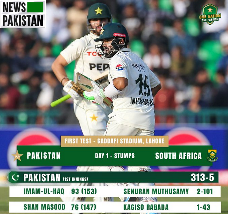 GADDAFI STADIUM (LAHORE): Pakistan, that chose to bat, were 313 runs for 5 wickets at stumps on the 1st day (12th Oct, 2025) of the 1st Cricket Test match of the two match series being played here.