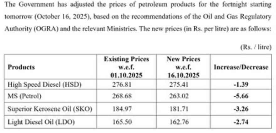 According to notification the Govt has adjusted the prices of petroleum products for the fortnight (starting 16.10.2025), based on the recommendations of the Oil and Gas Regulatory Authority (OGRA) and the relevant Ministries.