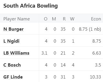 Proteas: Quinton de Kock, Reeza Hendricks, Tony de Zorzi, Dewald Brevis, Matthew Breetzke, Donovan Ferreira (Skipper), George Linde, Corbin Bosch, Lizaad Williams, Nandre Burger, Lungi Ngidi.