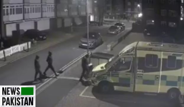 LONDON: CCTV footages show three hooded people poured gasoline on the ambulances and set them ablaze.