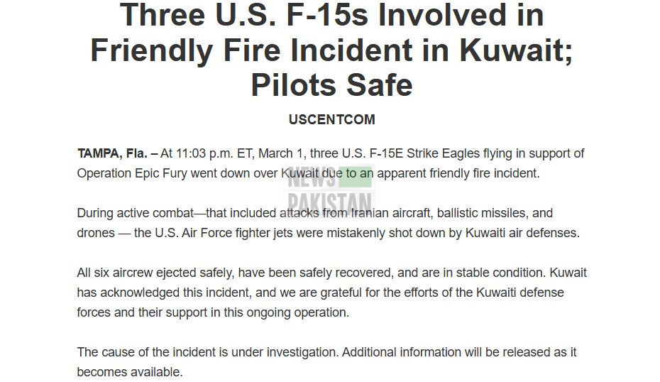 According to Centcom: “Three U.S. F-15E Strike Eagles flying in support of Operation Epic Fury went down over Kuwait due to an apparent friendly fire incident. During active combat—that included attacks from Iranian aircraft, ballistic missiles, and drones — the U.S. Air Force fighter jets were mistakenly shot down by Kuwaiti air defenses.