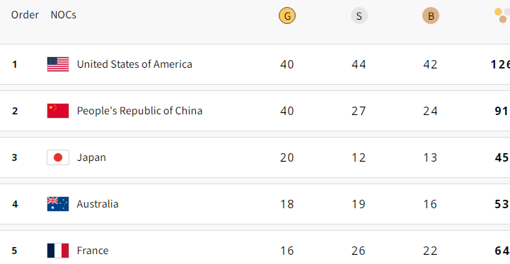 Topper USA clinched 40 Golds, 44 Silvers and 42 Bronzes; Runner-up China mustered 91 accolades up (40 Golds, 27 Silvers and 24 Bronzes); Japan with 20 golds cosily perches on the third postilion; Australia won 18 Gold Medals while the Host (France) captured 16 Golds.